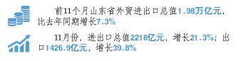 11月份当月,山东进出口总值2218亿元,年内第三次刷新历史纪录,增长21.3%。其中,出口1426.9亿元,同为年内第三次创历史新高,增长39.8%;进口791.1亿元,下降2%。