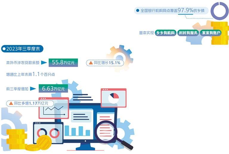 随着普惠金融的深入推进,金融服务覆盖面逐步扩大,尤其是县域和农村地区基础金融服务发展迅速。目前,全国银行机构网点覆盖97.9%的乡镇,基本实现乡乡有机构、村村有服务、家家有账户。2023年三季度末,本外币涉农贷款余额55.8万亿元,同比增长15.1%,增速比上年末高1.1个百分点;前三季度增加6.63万亿元,同比多增1.17万亿元。