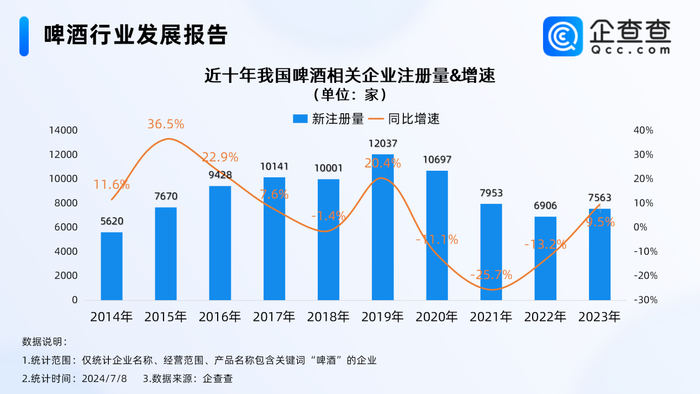 数据显示,2014年至2019年期间,我国啤酒相关企业注册量基本逐年增加,2019年全年注册12037家,是2014年同期的2倍多,达到了近十年啤酒相关企业注册量的峰值。此后,年度注册量逐年减少,至2022年,全年注册6906家,而到了2023年,我国啤酒行业在市场竞争和消费升级的双重驱动下,又展现出了稳健的增长态势,全年啤酒相关企业注册量同比增加9.5%至7563家。
