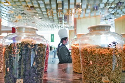 北京同仁堂知嘛健康零号店餐厅内摆放的草本食材。新华社发