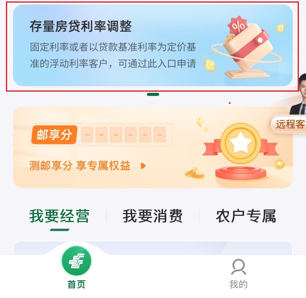 △邮储银行“贷款”页面中已有“存量房贷利率”相关区域。