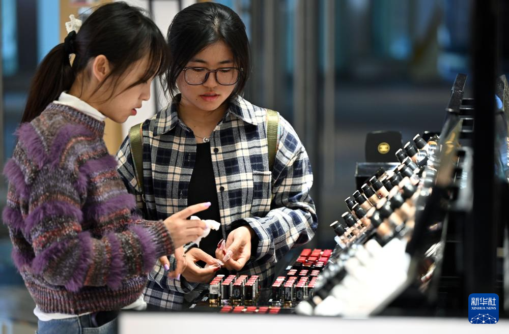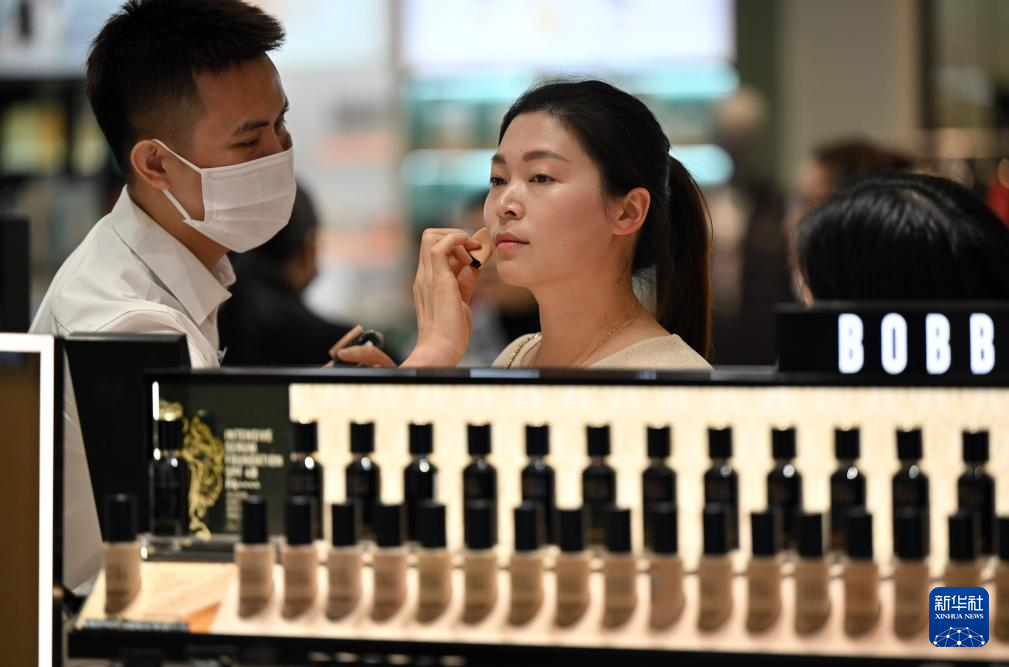 12月21日,顾客在海南省海口市日月广场免税店试用化妆品。新华社记者郭程摄