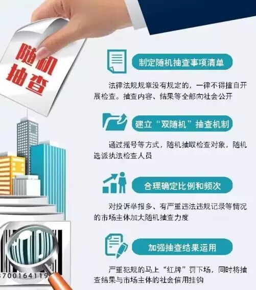 《通知》提出了大力推广随机抽查监管的具体措施:一是制定随机抽查事项清单。法律法规规章没有规定的,一律不得擅自开展检查。对法律法规规章规定的检查事项,要大力推广随机抽查,不断提高随机抽查在检查工作中的比重。 二是建立“双随机”抽查机制。要建立随机抽取检查对象、随机选派执法检查人员的“双随机”抽查机制,严格限制监管部门自由裁量权。三是合理确定随机抽查的比例和频次。对投诉举报多、列入经营异常名录或有严重违法违规记录等情况的市场主体,要加大随机抽查力度。四是加强抽查结果运用。对抽查发现的违法违规行为,要依法依规加大惩处力度,形成有效震慑,增强市场主体守法的自觉性。抽查情况及查处结果要及时公布,接受社会监督。